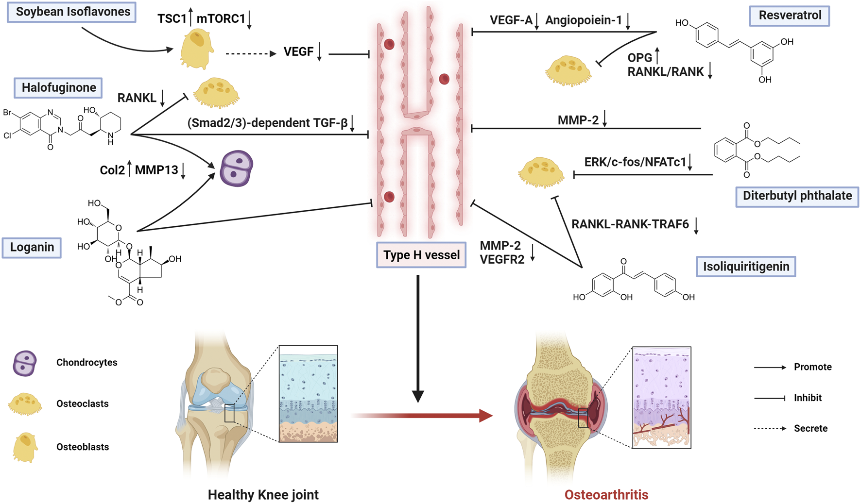Resveratrol, a naturally occurring non-flavonoid polyphenol found in grapes, blueberries, and other dietary sources, exhibits potent antioxidant and anti-inflammatory properties (Meng et al., 2020). In an ACLT-induced OA mouse model, Xiong et al. demonstrated that intraperitoneal Resveratrol administration exerts dual protective effects by suppressing type H vessel formation to preserve articular cartilage structure and delay cartilage degeneration, while simultaneously inhibiting osteoclast differentiation and activity to reduce pathological osteoclast accumulation and bone resorption in subchondral bone (Xiong et al., 2021). Mechanistically, Resveratrol modulates the OPG/RANKL/RANK pathway to suppress osteoclastogenesis and reduce bone resorption while downregulating VEGF-A and Angiopoietin-1 expression to inhibit aberrant type H vessel generation, thereby disrupting the pathological angiogenesis-osteogenesis coupling and ultimately slowing OA progression. By simultaneously targeting multiple components of the vascular-bone-cartilage network, Resveratrol not only provides novel insights into OA pathogenesis but also represents a promising foundation for developing natural product-based therapeutic strategies against OA. However, as Resveratrol is a pan-assay interfering substance (Magalhães et al., 2021), and the study was conducted exclusively in vivo with limited quantitative analysis of staining and no complementary in vitro validation, further investigations using molecular and cellular approaches would be valuable to clarify its direct targets and confirm its therapeutic potential.