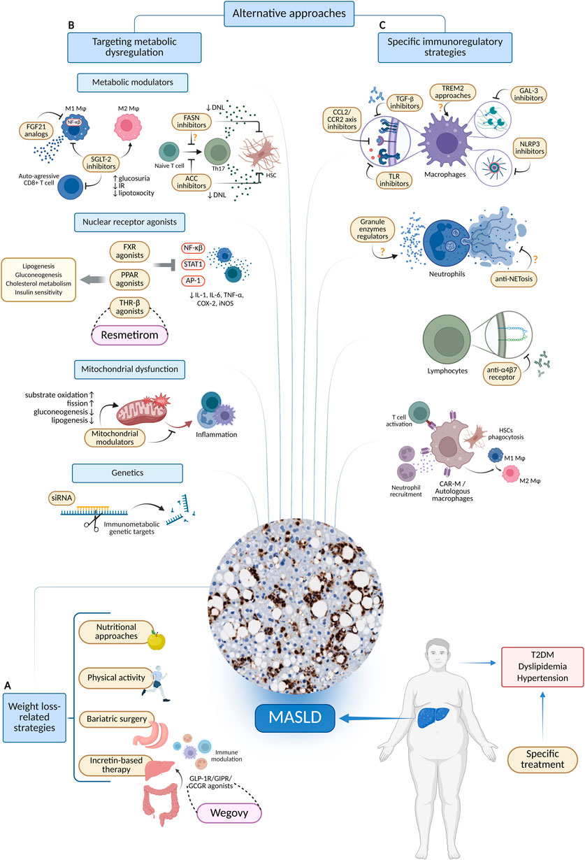 Figure 1. Therapeutic approaches targeting metabolic and immune alterations in MASLD. (A) Strategies associated with obesity. (B) Therapies focused on metabolism. (C) Specific strategies for immune modulation. Created in BioRender. Joven, J. (2025) https://BioRender.com/d9mzal6. Abbreviations: ACC, acetyl-CoA carboxylase; AP-1, activator protein 1; CAR-M, chimeric antigen receptor modified macrophage; CCL2, C-C motif chemokine ligand 2; CCR2, C-C chemokine receptor 2; COX-2, cyclooxygenase 2; DNL, de novo lipogenesis; FASN, fatty acid synthase; FGF21, fibroblast growth factor 21; GAL3, galectin 3; GCGR, glucagon receptor; GIPR, glucose dependent insulinotropic polypeptide receptor; GLP-1, glucagon like peptide 1; HSC, hepatic stellate cell; IL-1, interleukin 1; IL-6, interleukin six; iNOS, inducible nitric oxide synthase; MASLD, metabolic dysfunction-associated steatotic liver disease; NET, neutrophil extracellular trap; NF-κB, nuclear factor of the κ chain in B cells; NLRP3, nucleotide binding domain, leucine-rich repeat protein 3; SGLT-2, sodium glucose cotransporter 2; siRNA, small interfering RNA; STAT1, signal transducer and activator of transcription 1; T2DM, type 2 diabetes mellitus; TGF-β, transforming growth factor β; Th17, T helper 17 cells; THR-β, thyroid hormone receptor β; TLR, toll like receptor; TNFα, tumor necrosis factor alpha; TREM2, triggering receptor expressed on myeloid cells 2.