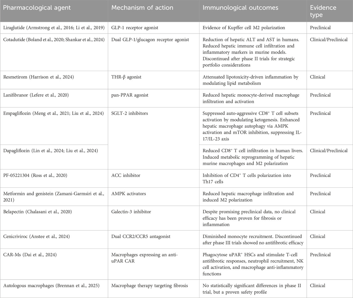Beyond nuclear receptors, other metabolic modulators demonstrate how targeting specific metabolic pathways can directly reprogram immune cell function. A notable example is the sodium-glucose cotransporter 2 (SGLT-2), a membrane protein that reabsorbs most of the filtered glucose in the early proximal tubules of the kidney. Pharmacologic SGLT-2 inhibitors promote glycosuria, reduce insulin resistance and lipotoxicity, and create sustained caloric deficits, leading to decreased body weight and concomitant hepatic improvements in MASLD (Ong Lopez and Pajimna, 2024). These metabolic shifts are coupled to direct immunoregulatory actions. In murine models, empagliflozin ameliorates MASH by directly suppressing auto-aggressive CXCR6+ CD8+ T cell activation and infiltration through ketogenesis-dependent mechanisms (Liu et al., 2024). It also enhances autophagy in hepatic macrophages via AMPK/mTOR signaling, suppressing the IL-17/IL-23 axis (Meng et al., 2021). Similarly, dapagliflozin and canagliflozin inhibit M1 macrophage glycolysis and promote reprogramming toward oxidative metabolism consistent with M2 polarization in the murine liver (Lin et al., 2024). However, clinical evidence supporting these immunomodulatory mechanisms remains limited. Fibroblast growth factor 21 (FGF21) is a liver-derived endogenous hormone whose pharmacologic analogs exhibit therapeutic promise in obesity, type 2 diabetes, and MASLD by regulating lipid metabolism and enhancing insulin sensitivity (Jin et al., 2023). Beyond metabolic effects, FGF21 suppresses macrophage expression of pro-inflammatory cytokines, including TNFα, IL-6, IL-1β, and IFN-γ, by promoting NRF2 nuclear translocation and inhibiting NF-κB signaling (Yu et al., 2016). Consistently, FGF21 analog administration in obese nonhuman primates with MASLD reduced hepatic neutrophil and macrophage infiltration (Cui et al., 2020). In phase IIb studies, pegozafermin improved fibrosis, whereas efruxifermin achieved both fibrosis and MASH resolution (Harrison et al., 2023; Loomba et al., 2023).