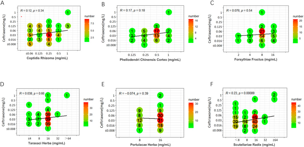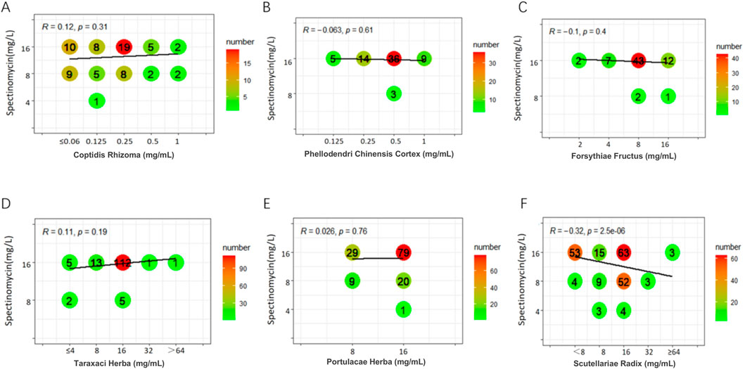 Figure 3. Six graphs display the correlation between Spectinomycin concentration and various herbal extracts: Coptidis Rhizoma (A), Phellodendri Chinensis Cortex (B), Forsythiae Fructus (C), Taraxaci Herba (D), Portulacae Herba (E), and Scutellariae Radix (F). Each graph is labeled with an “R” value and “p” value, indicating the strength and significance of the correlation. The bubble sizes represent the number of samples, with a color gradient from green to red, indicating increasing numbers.