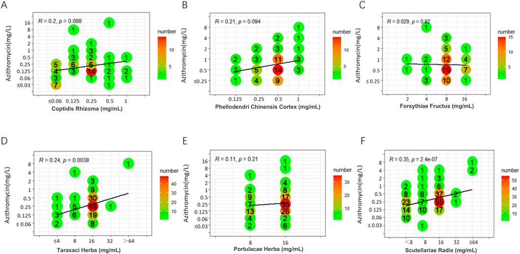Figure 2. Six scatter plots (A-F) show the correlation between azithromycin concentration and six different herbal components, each subplot representing a different herb: Coptidis Rhizoma, Phellodendri Chinensis Cortex, Forsythiae Fructus, Taraxaci Herba, Portulacae Herba, and Scutellariae Radix. The plots display correlation coefficients (R) and p-values. The data points are marked with numbers indicating their frequency, with a color gradient from green to red showing increasing numbers. The trend lines in each plot represent the correlation between the herb concentrations and azithromycin levels.