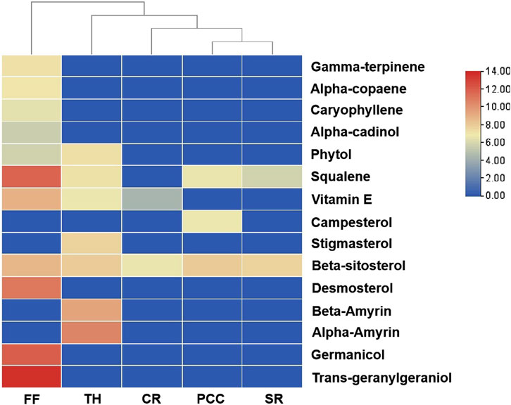Figure 4. Heatmap of chemical metabolites from five traditional Chinese medicines. FF, Forsythiae Fructus; TH, Taraxaci Herba; CR, Coptidis Rhizoma; PCC, Phellodendri Chinensis Cortex; SR, Scutellariae Radix.
