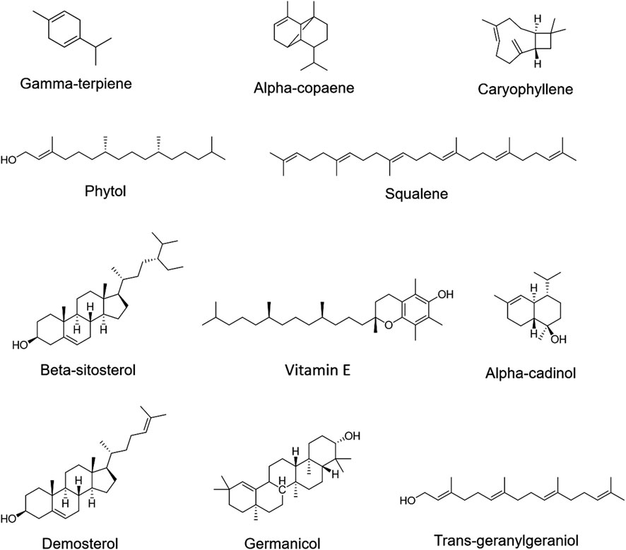 To identify active metabolites with potential antibacterial effects, five TCMs (CR, PCC, TH, FF, and SR) with low MIC values as noted in Section 3.1, were analyzed via GC-MS. The results are presented in Figure 4. A total of 15 metabolites were detected, with all five TCMs containing β-sitosterol. Additionally, squalene was detected in four TCMs (PCC, TH, FF, and SR), vitamin E in three TCMs (CR, TH, and FF), and phytol in two TCMs (FF and TH). Among these, FF contained the largest number of detected metabolites, including gamma-terpiene, alpha-copaene, caryophyllene, alpha-cadinol, phytol, squalene, beta-sitosterol, vitamin E, demosterol, germanicol, and trans-geranylgeraniol. The representative chromatograph for FF is shown in Figure 5, and the chemical structural formulas these metabolites are illustrated in Figure 6.