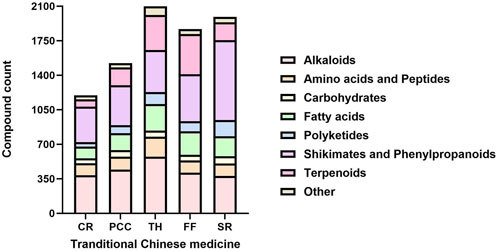 Figure 7. Stacked bar charts depicting the count distribution of metabolites categorized by metabolic pathways across five traditional Chinese medicines (CR, PCC, TH, FF, and SR). CR, Coptidis Rhizoma; PCC, Phellodendri Chinensis Cortex; TH, Taraxaci Herba; FF, Forsythiae Fructus; SR, Scutellariae Radix.