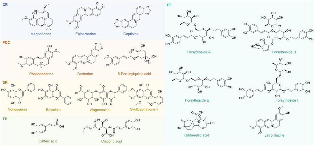 Figure 8. 18 Representative metabolites from CR, PCC, SR, TH and FF. CR, Coptidis Rhizoma; PCC, Phellodendri Chinensis Cortex; SR, Scutellariae Radix; TH, Taraxaci Herba; FF, Forsythiae Fructus.