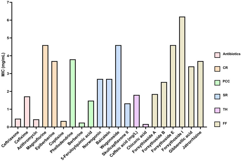 Figure 9. The average MIC value of representative metabolites in antibiotics, CR, PCC, SR, TH and FF. CR, Coptidis Rhizoma; PCC, Phellodendri Chinensis Cortex; SR, Scutellariae Radix; TH, Taraxaci Herba; FF, Forsythiae Fructus.