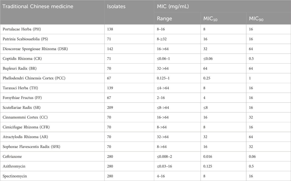 Results: Coptidis Rhizoma (CR) exhibited the lowest MIC10 of ≤0.06 mg/mL and lowest MIC90 of ≤0.5 mg/mL. Six TCMs showed no correlation with the MIC values of ceftriaxone, spectinomycin or azithromycin.