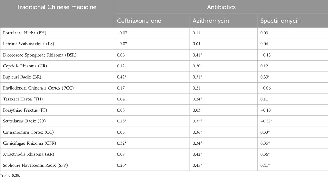 To assess potential cross-resistance of N. gonorrhoeae to various drugs, the correlation between 13 TCMs and the antibiotics spectinomycin, ceftriaxone, and azithromycin was analyzed (Table 2), along with their R values and P-values. Notably, correlations between ceftriaxone and TCMs were only observed for BR and CFR, with correlation coefficients of R = 0.42 and 0.32, respectively (P < 0.05).
