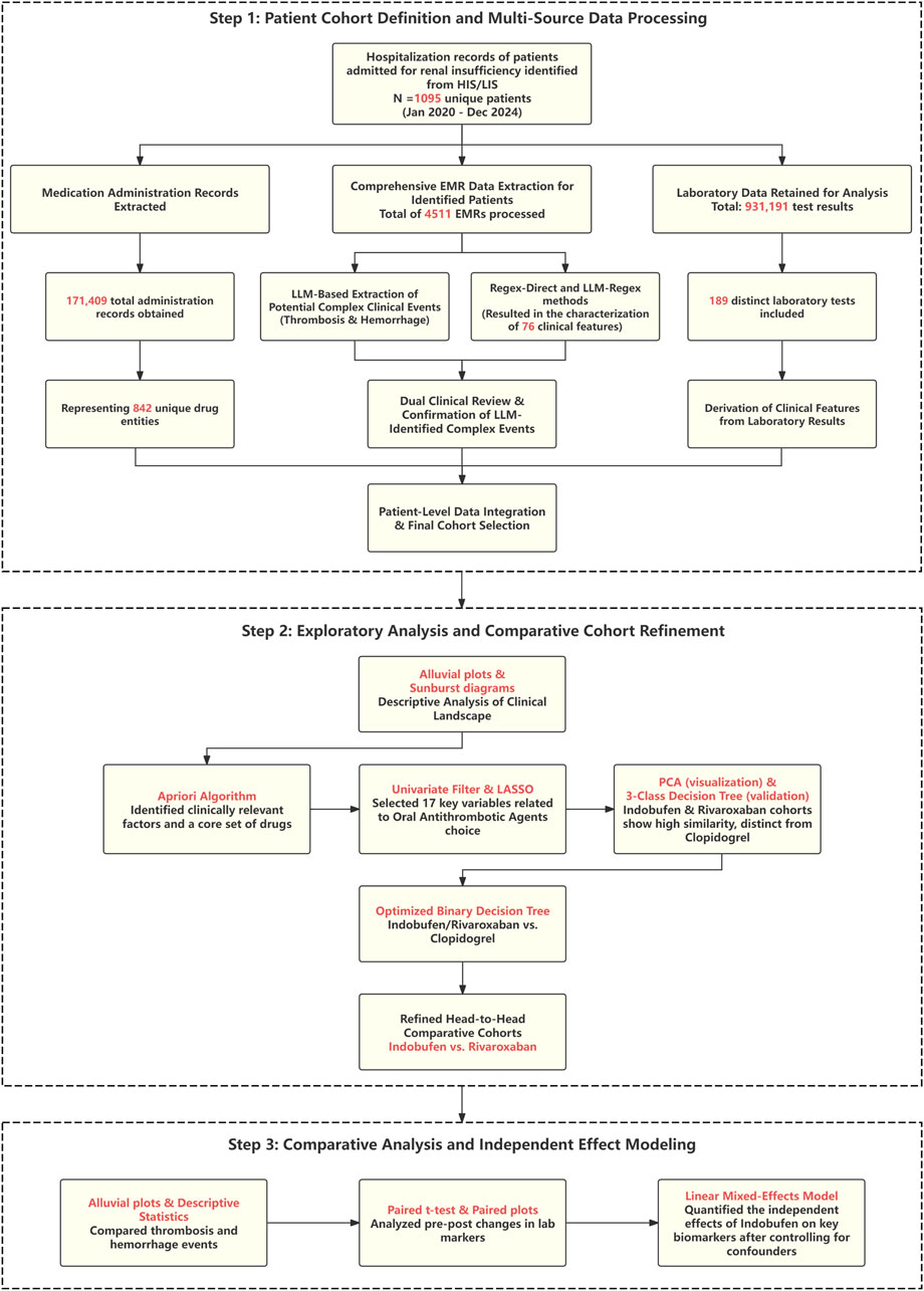Figure 1. Flowchart of the study design and analytical workflow. The process begins with the definition of the patient cohort and the extraction of multi-source data using methods including Large Language Models (LLMs). Subsequently, a machine learning pipeline (including Apriori, LASSO, PCA, and decision trees) is used to refine the analysis to a head-to-head comparison of Indobufen and Rivaroxaban. Finally, a Linear Mixed Model (LMM) is applied to assess the independent effects of the target medication on clinical outcomes and laboratory parameters.