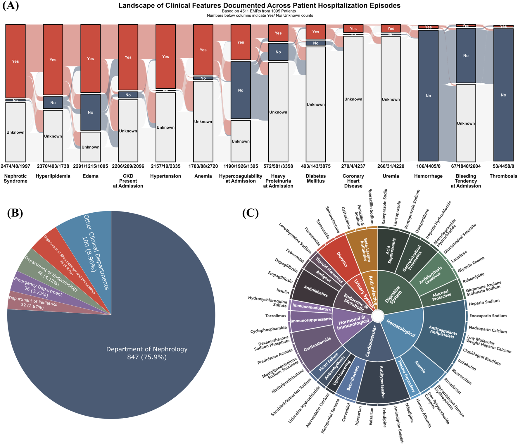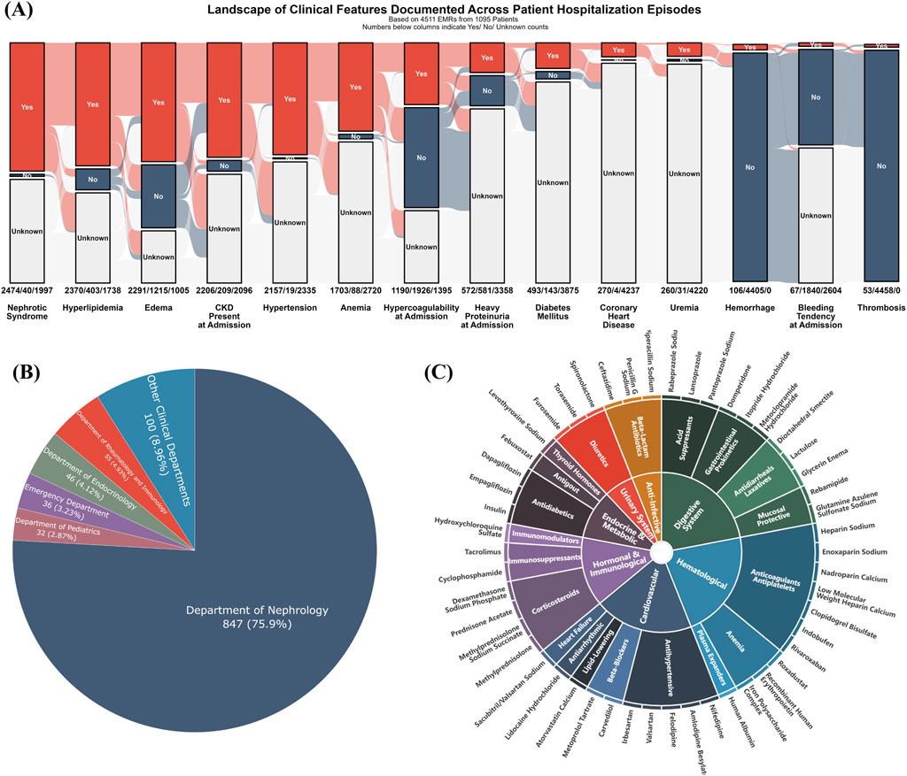 Figure 2. Baseline clinical landscape and medication profile of the study cohort. (A) Alluvial plot illustrating the prevalence of key clinical features, with counts for “Yes,” “No,” and “Unknown” statuses indicated across all 4,511 hospitalization events; (B) Pie chart depicting patient distribution by clinical department, predominantly Nephrology (75.9%); (C) Sunburst diagram illustrating the hierarchical classification of medications, focusing on the top 50 most frequently administered agents across all hospitalization episodes. Inner rings represent major therapeutic categories, and outer rings detail more specific drug subclasses or types.