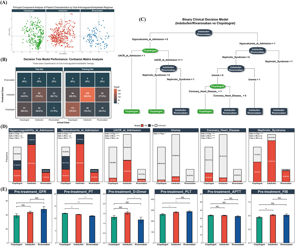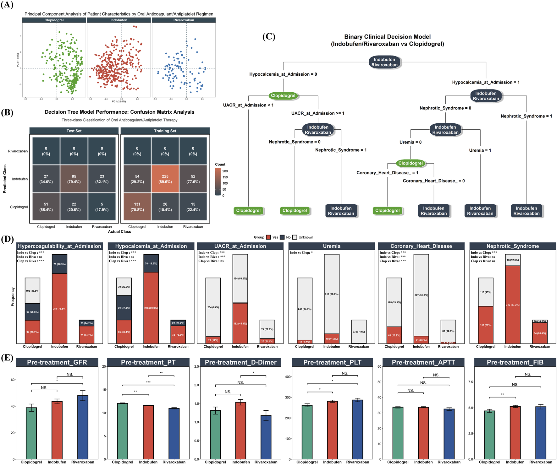 Figure 4. Baseline Characteristics and Oral Antithrombotic Selection. (A) PCA plot of 17 selected baseline clinical variables for patients receiving Clopidogrel (green), Indobufen (red), or Rivaroxaban (blue); (B) Confusion matrix illustrating the performance of an initial three-class decision tree model on both training and test sets; (C) Optimized binary clinical decision tree model distinguishing Clopidogrel use from combined Indobufen/Rivaroxaban use. Model performance: F1 score = 0.794, AUC = 0.811; (D) Distribution of key decision tree predictor variables across the three original drug groups; (E) Baseline pre-treatment levels of eGFR, PT, APTT, FIB, D-Dimer, and PLT across the three drug groups.