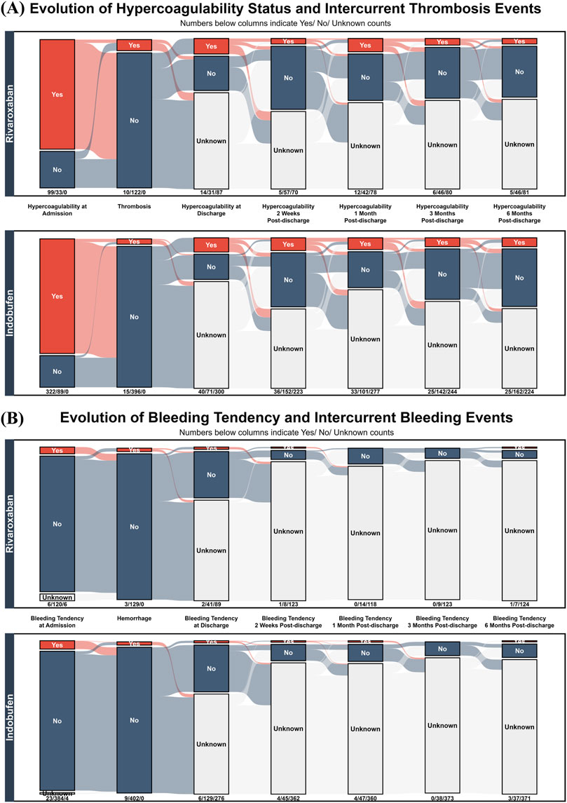 Figure 5. Longitudinal Trajectories of Thrombotic and Bleeding Events in Rivaroxaban and Indobufen Cohorts. Alluvial plots showing the temporal evolution of (A) hypercoagulability/thrombosis and (B) bleeding tendency/hemorrhage in patients treated with Rivaroxaban (top panels) versus Indobufen (bottom panels). The plots track patient status from admission to 6 month follow-up.