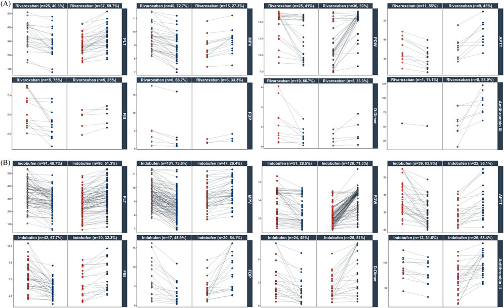 Figure 6. Individual patient responses to Rivaroxaban and Indobufen. Paired plots show changes in key platelet and coagulation parameters from pre-treatment (red) to post-treatment (blue). Panels are stratified by drug ((A): Rivaroxaban; (B) Indobufen) and further subdivided by the direction of change (decrease vs. increase). Percentages in the panel titles indicate the proportion of patients in each subgroup.