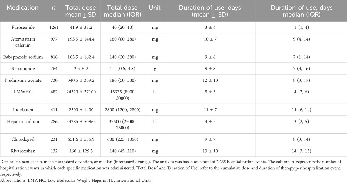 To transition from this broad exploration to a focused analysis of oral antithrombotic drug selection patterns, a specific cohort was defined for all subsequent analyses. Based on the strict inclusion and exclusion criteria detailed in the Methods section (focusing on patients who received antithrombotic therapy for a clear clinical indication). Figure 3E illustrates the intricate co-prescription patterns among core medications within this focused cohort, and Table 1 details the corresponding distributions of total dosage and duration of use for these medications.