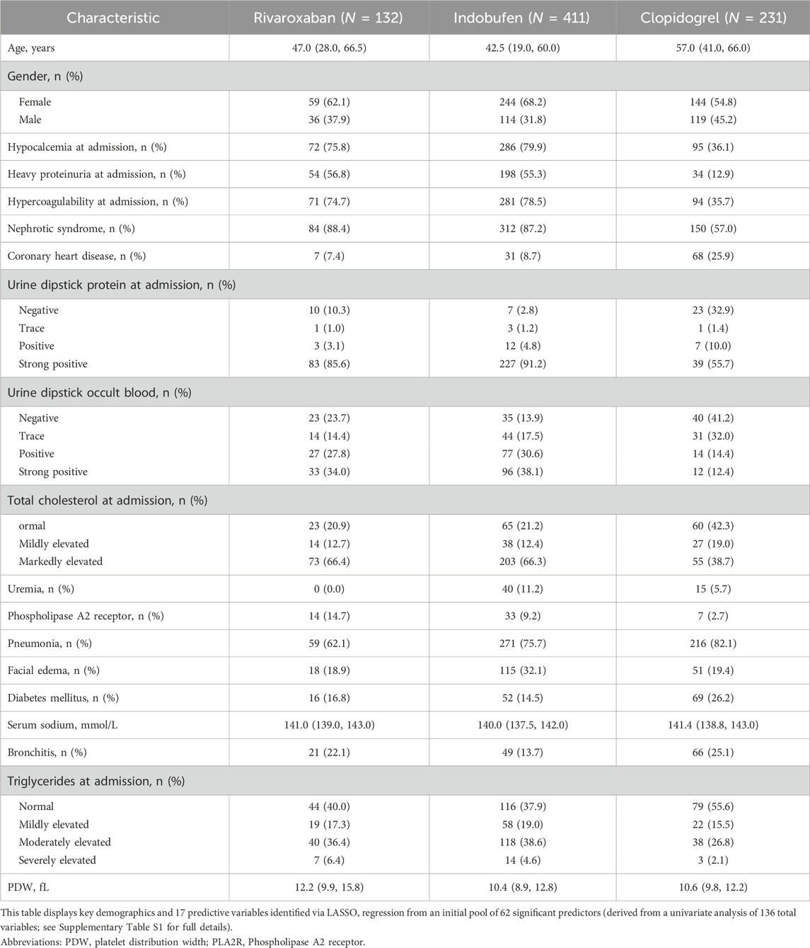 This study employed a multi-stage analytical strategy to first identify clinical patterns associated with a hypercoagulable state and then to elucidate the factors driving the selection of specific oral antithrombotic agents. First, we utilized association rule mining with the Apriori algorithm (implemented in the R package “arules”) to identify clinical features and medication combinations that co-occurred with a hypercoagulable state (Si et al., 2022). Next, the analysis focused on the selection of specific oral antithrombotic agents (rivaroxaban, indobufen, and clopidogrel). We initially screened for clinical features associated with the choice of these drugs by performing a differential analysis of baseline characteristics, with an p-value <0.05 considered significant. Subsequently, LASSO (Least Absolute Shrinkage and Selection Operator) regression was employed to perform feature reduction and refine the selection of key predictors (Luo et al., 2023).