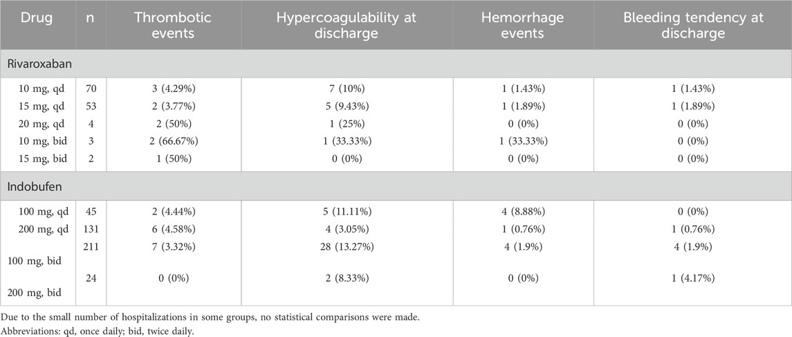 Finally, this study has several limitations that inform future research. Our analysis framework, designed to analyze real-world EHR data, cannot directly measure pharmacokinetic (PK) or pharmacodynamic (PD) parameters. Its utility lies in generating hypotheses from large-scale clinical observations. For instance, the analysis was structured to compare drug-level effects rather than dose-specific outcomes—a methodological choice to avoid the model overfitting and loss of statistical power that would result from fragmenting the cohort into smaller subgroups. This approach revealed that patients receiving indobufen “100 mg, bid” showed a significantly greater resolution of hypercoagulability than those on “200 mg, qd,” despite an identical total daily dose (Table 3). This finding suggests that dosing frequency, and by extension the underlying PK/PD profile, may influence clinical efficacy. It raises a question that our RWD platform is suited to identify but not directly answer: why the same daily dose yields different outcomes. Answering this requires a dedicated mechanistic study integrating our findings with direct PK/PD measurements (e.g., drug concentrations via LC-MS and platelet function via thromboelastography). Therefore, this study serves not as a final conclusion, but as a foundational step to guide future, targeted mechanistic research.