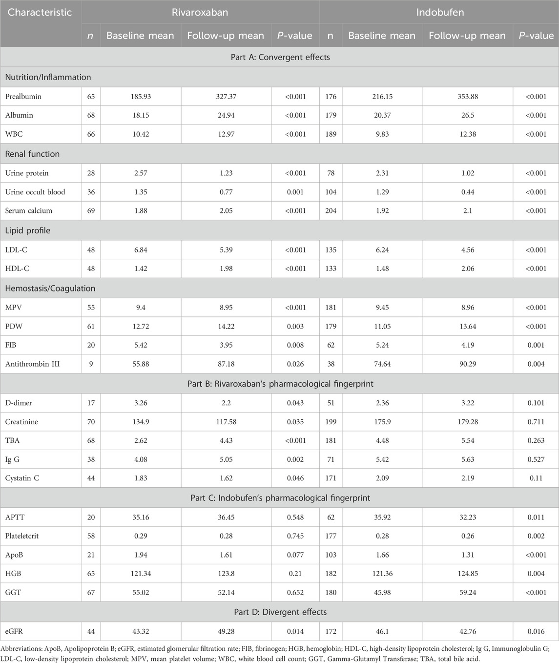 Before assessing treatment effects, we first confirmed that the treatment exposure was comparable between the two drug cohorts. Table 1 demonstrates similar durations of use for indobufen and rivaroxaban, which provides the rationale for a direct pre-post comparison. Therefore, paired t-tests were initially used to quantify the changes in various laboratory parameters from pre-to post-treatment. Due to the large number of parameters with significant changes, Table 4 focuses on presenting a selection of the most clinically relevant and statistically significant results. A complete analysis of all tested variables can be found in Supplementary Table S2.
