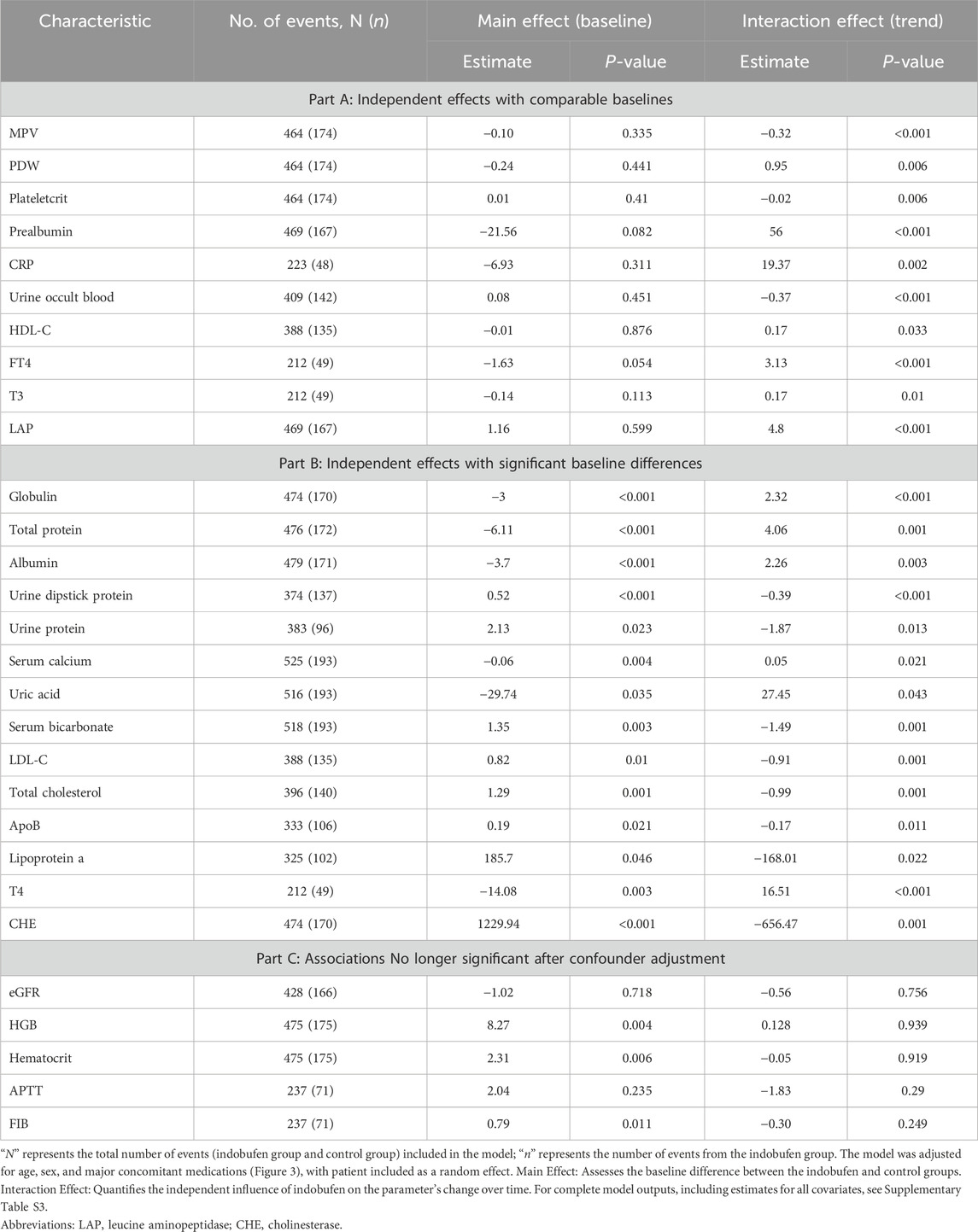 Moreover, in clinical practice, patients often receive combination therapy, creating a significant risk of confounding bias where observed changes cannot be attributed to indobufen alone. To isolate the effects of indobufen from the confounding bias of combination therapy, we employed a LMM, adjusting for age, sex, and key concomitant medications. This analysis provided more robust evidence for indobufen’s known antiplatelet activity (Liu et al., 2023; Dai C. et al., 2024; Dai W.-B. et al., 2024), Reinforcing its independent role in decreasing MPV and plateletcrit while increasing PDW (Table 5, Part A). More interestingly, the LMM uncovered potential pleiotropic effects, linking indobufen independently to increases in prealbumin and HDL-C. This finding is supported by recent research suggesting indobufen can modulate the MAPK inflammatory pathway (Bai et al., 2024). However, this pleiotropy has clear boundaries, it does not extend to broad antioxidant effects, as indobufen does not alter F2-isoprostane generation driven by oxidative stress (Davì et al., 1999). Finally, while the model also linked indobufen to elevated thyroid hormones (FT4, T3), we interpret this not as a direct drug effect but as a likely confounding signal. Such fluctuations are characteristic of Non-Thyroidal Illness Syndrome (NTIS) in CKD patients and probably reflect overall clinical improvement rather than a specific pharmacological action (Yan et al., 2017; Mahashabde et al., 2024).