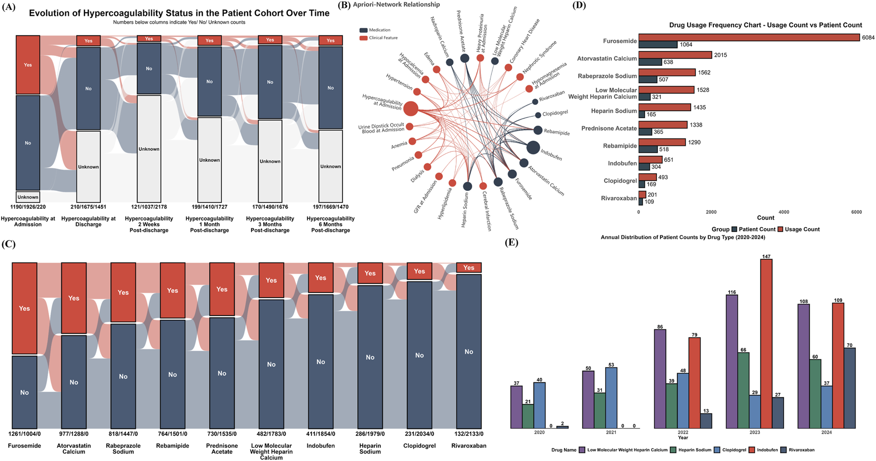 Figure 3. Hypercoagulable State Dynamics, Associated Factors, and Medication Use (A) Alluvial plot depicting the temporal evolution of hypercoagulable status from admission through 6 months post-discharge; (B) Apriori association network illustrating co-occurrence relationships between common clinical characteristics (red nodes) and frequently prescribed medications (blue nodes); (C) Yearly (2020-2024) total usage and number of unique patients for all medications identified as associated with hypercoagulable states; (D) Yearly (2020-2024) patient count distribution for selected anticoagulant and antiplatelet medications; (E) Alluvial plot illustrating co-prescription patterns in the focused cohort (n = 2,265 hospitalization events). Each axis represents a medication, segmented by use (Yes) or non-use (No). Flows indicate the number of events sharing specific medication combinations.