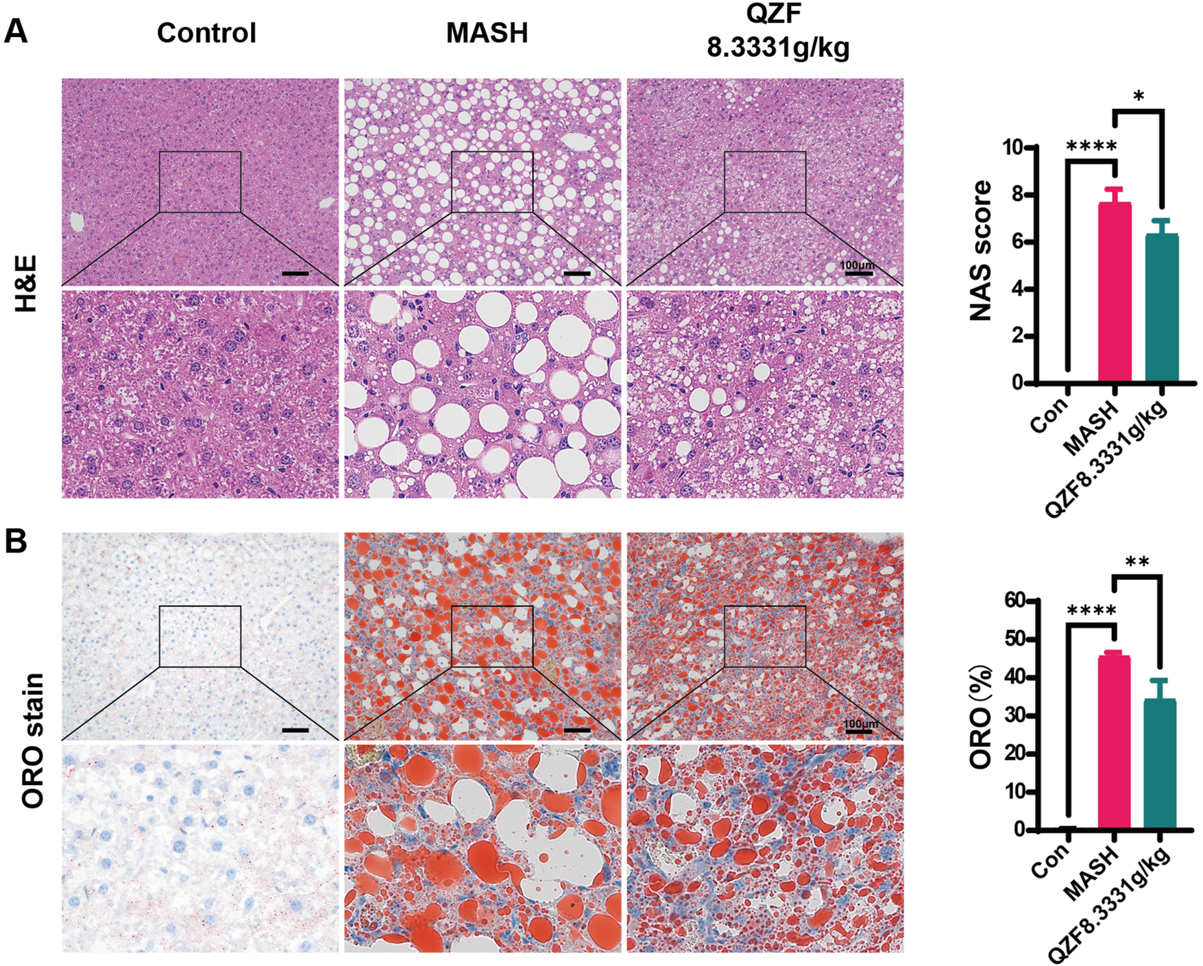 QZF was administered orally at a dose of 8.3331 g/kg/day or 4.1666 g/kg/day for 4 weeks following the establishment of the MASH model. The composition and dosage were based on previous clinical and pharmacological studies.