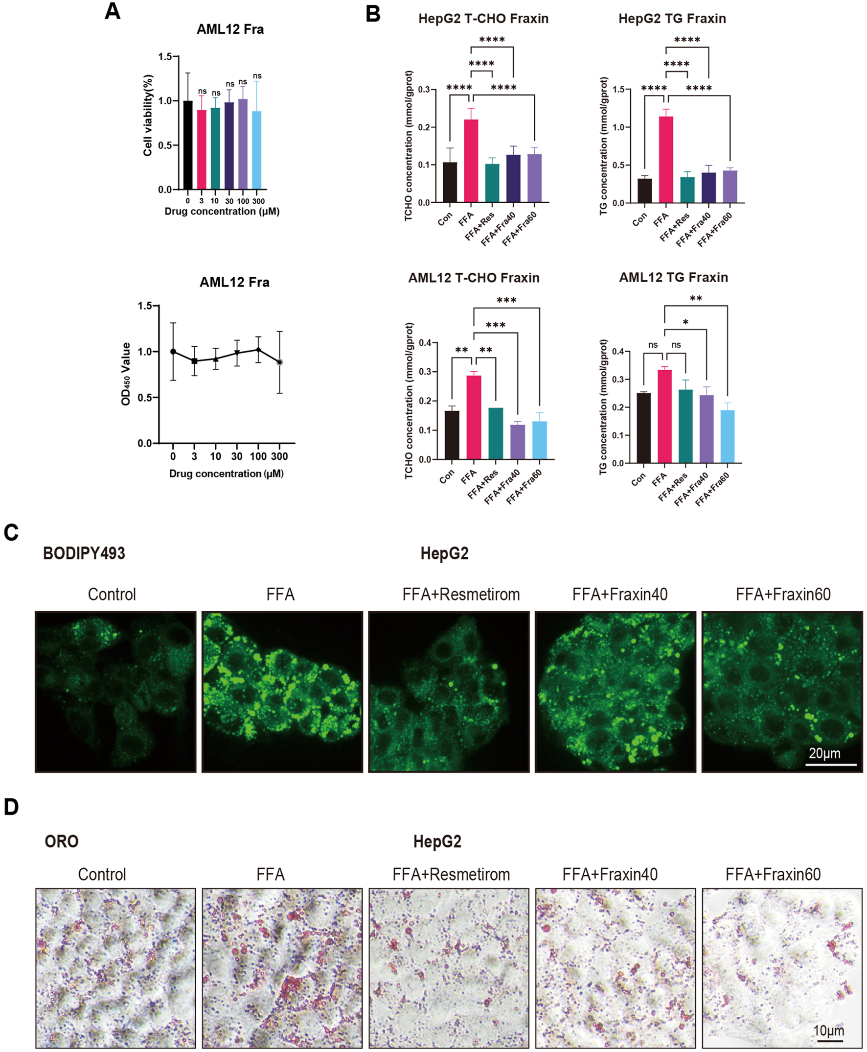 AML12 cells were first exposed to 100 µM OA and 50 μM PA for 24 h, followed by 24-h treatment with Fraxin at graded concentrations (40 and 60 µM) or 10 µM Resmetirom. Subsequently, cellular lysates were collected by centrifugation. Hepatic lipid profiles were quantified using commercially available enzymatic assay kits (Total Cholesterol: A111-2-1; Triglycerides: A110-2-1, Nanjing Jiancheng Bioengineering Institute) according to the manufacturer’s protocols, with optical density measurements normalized to total protein content.