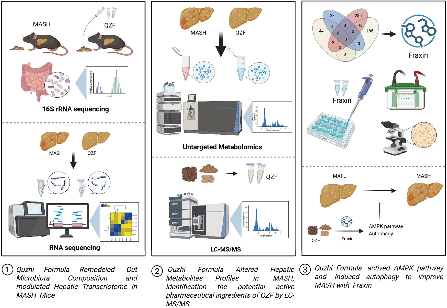 Collectively, QZF is rationally designed based on the pathophysiological characteristics of MASH, integrating optimized phytochemical synergies to target multifactorial disease mechanisms. In this study, integrated multi-omics analyses reveal that QZF alleviates MASH by modulating the gut-liver axis to restore microbial diversity, suppress pro-steatotic Enterococcus, and activate autophagy-driven metabolic reprogramming, thereby reducing hepatic lipid accumulation and positioning QZF as a systems-level therapeutic for metabolic disorders.
