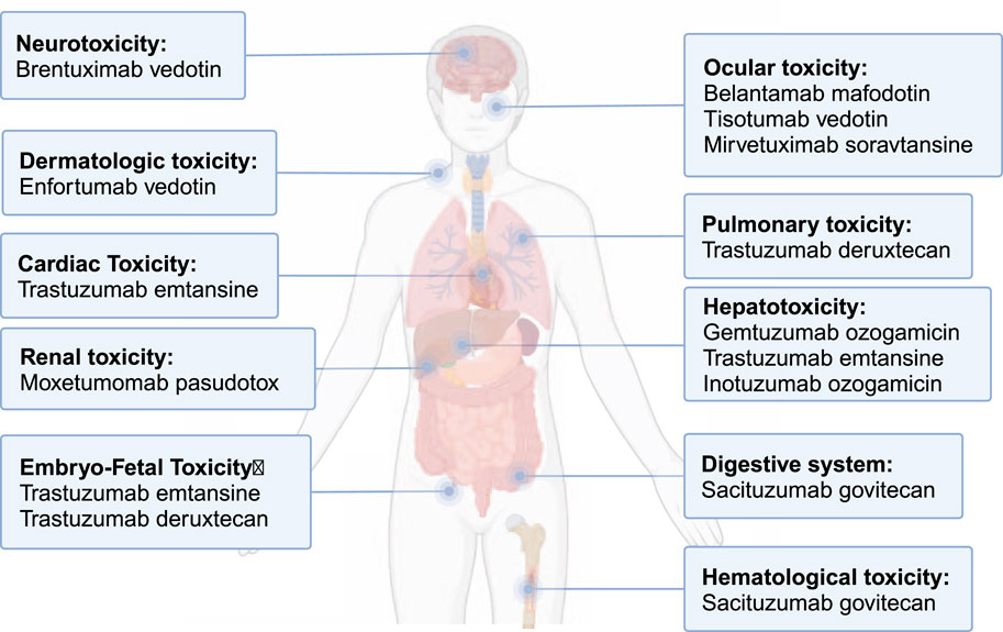 Figure 1. Toxicity received FDA black-box warnings among approved ADCs. This figure summarizes approved ADCs that carry black-box warnings due to serious adverse events, such as hepatotoxicity, neurotoxicity, and other organ toxicities, which highlight the importance of post-marketing surveillance and careful monitoring during ADC therapy.