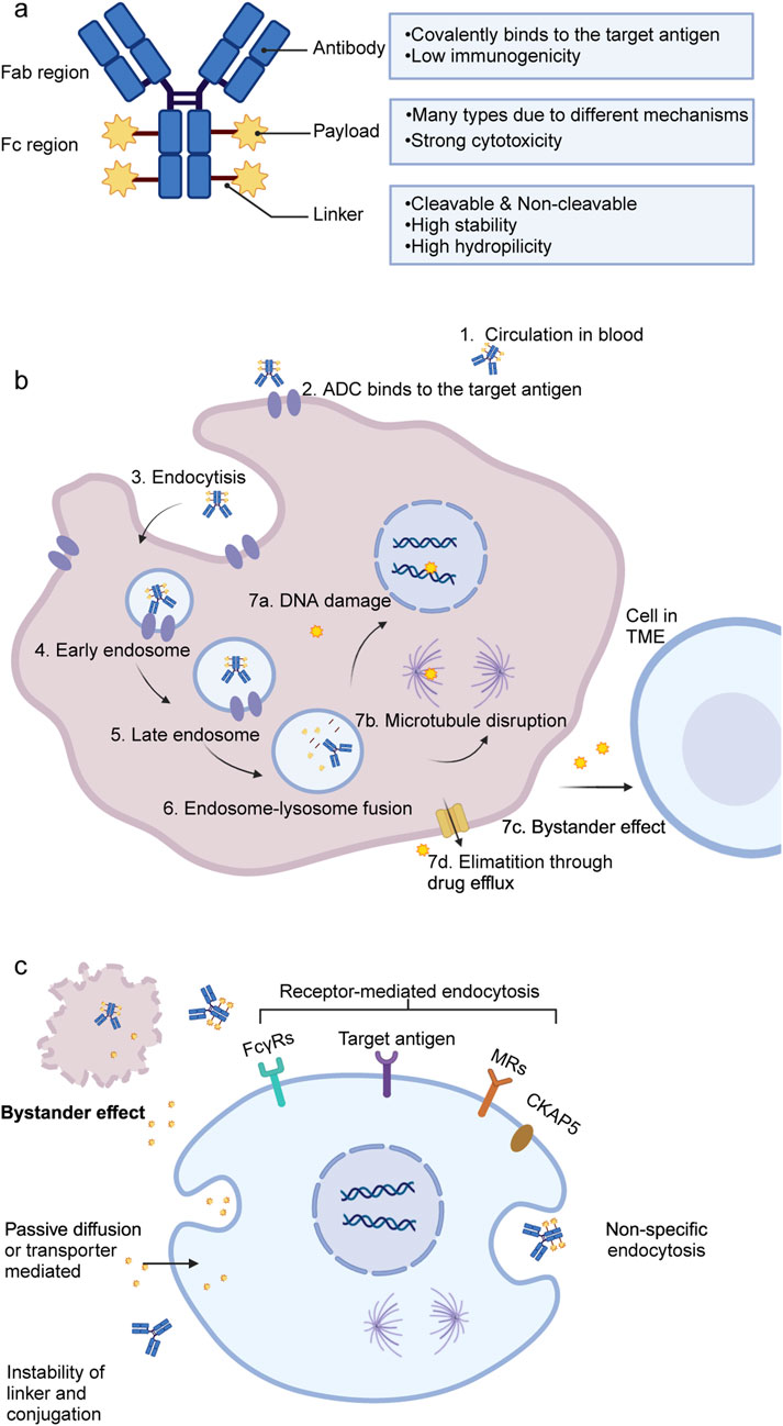 Upon binding to its target antigen, ADC is internalized into the target cell via endocytosis, progressing through early and late endosomes, and ultimately fuses with lysosomes. Within the lysosomes, the cytotoxic payload is released, triggering apoptosis or cell death by inhibiting DNA synthesis or disrupting microtubule formation (Figure 2b) (Drago et al., 2021). Additionally, the bystander effect, in which released payloads diffuse into neighboring cells, further enhances ADC-mediated anticancer activity, provided that the payload is permeable or transmembrane (Staudacher and Brown, 2017).