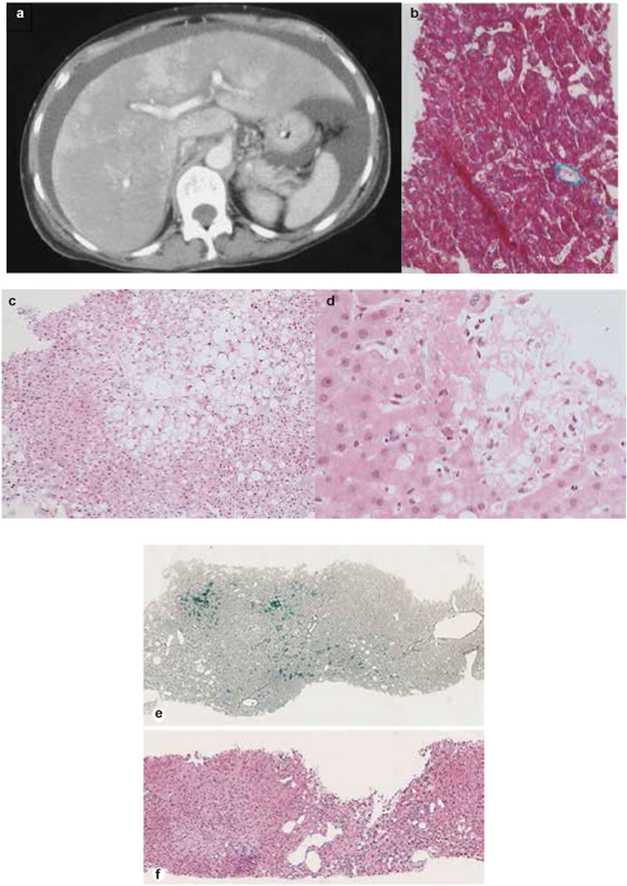 Figure 3. Representative imaging and liver biopsy findings of ADC-associated hepatotoxicity. (a) Abdominal CT scan showing massive ascites and heterogeneous hepatic enhancement consistent with veno-occlusive disease (VOD) after treatment with gemtuzumab ozogamicin. (b) Liver biopsy demonstrating sinusoidal congestion and perivenular hemorrhage compatible with early VOD. (c,d) Liver biopsy specimens from a patient treated with brentuximab vedotin, showing cholestatic liver injury and progressive hepatocellular changes at two different time points. (e,f) Liver biopsy from a patient treated with trastuzumab emtansine, showing features of nodular regenerative hyperplasia. (a, b) Reprinted with permission form Tack et al. (2001), Copyright © 2001 Macmillan Publishers Limited. (c, d) Reprinted from Neeman et al. (2019) with permission of the publisher (Taylor & Francis Ltd, http://www.tandfonline.com). (e, f) Reprinted with permission from Garrido et al. (2022), Copyright © 2022 Karger Publishers, Basel, Switzerland.