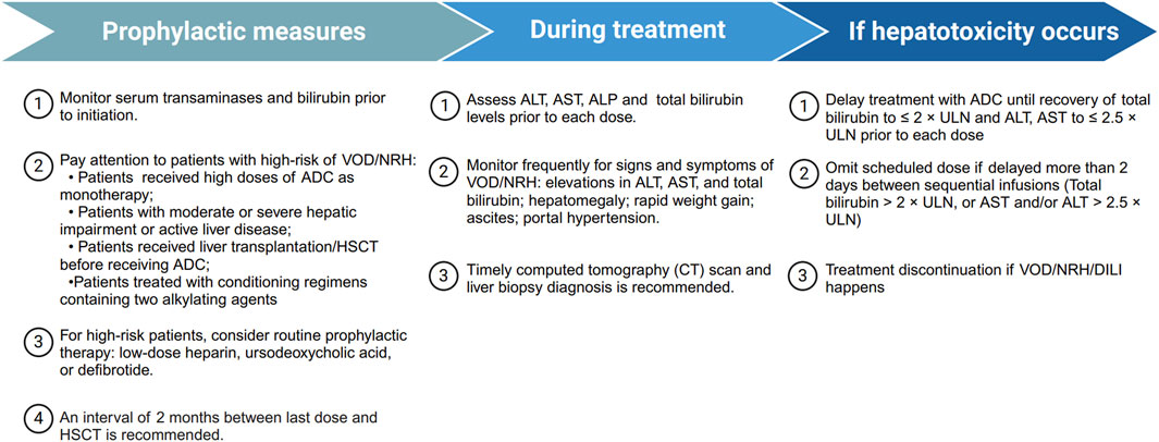 Preventive strategies focus on baseline risk stratification, early recognition, and careful monitoring throughout treatment. All patients should undergo baseline liver function and viral hepatitis screening prior to ADC initiation. Particular attention should be given to high-risk patients, including those who receive high doses of ADCs as monotherapy, patients with moderate or severe hepatic impairment or active liver disease, or those who have undergone liver transplantation or HSCT before ADC treatment. In these cases, routine prophylactic therapy with low-dose heparin, ursodeoxycholic acid, or defibrotide may be considered. For patients undergoing HSCT, a minimum interval of 2 months between the last ADC dose and transplantation is recommended (Kantarjian et al., 2019).