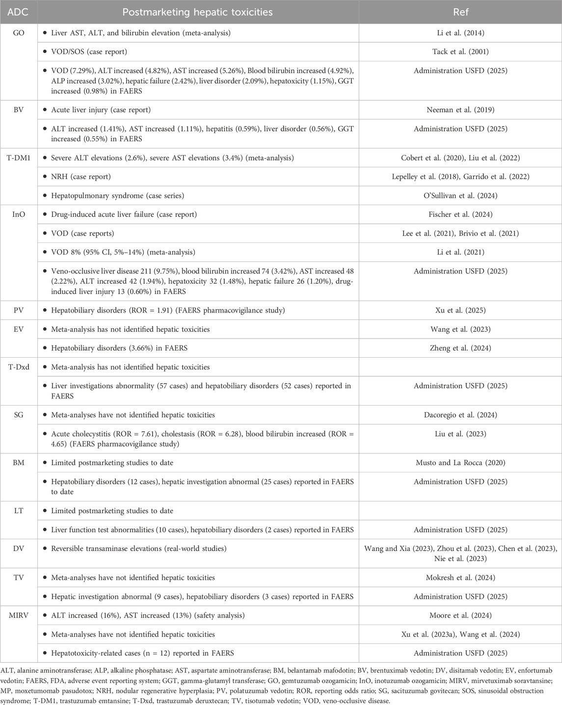 Antibody-drug conjugates (ADCs), described as ‘biological missiles,’ are targeted cancer therapies consisting of a monoclonal antibody, a cytotoxic agent, and a chemical linker (Fu et al., 2022). Since the approval of gemtuzumab ozogamicin (GO) by the FDA, ADC development has rapidly advanced, with 17 ADCs approved and over 100 in phase III trials as of December 2024 (Ruan et al., 2024; Crescioli et al., 2025). With the expanding clinical application of ADCs across diverse tumors, increasing attention has been drawn to treatment-related toxicities, particularly hepatotoxicity.