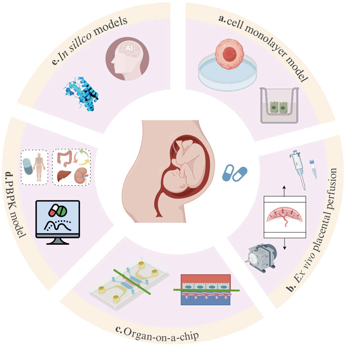 In recent years, with the advancement of computer and bioengineering technologies, methods for placental PK studies have developed considerably. In addition to the previously established in vitro methods (e.g., cell monolayer model, Figure 1a; ex vivo placental perfusion experiment; Figure 1b), several new attempts have been made (for example, organ-on-a-chip Figure 1c; PBPK model, Figure 1d; in silico models, Figure 1e). Multiple approaches have been attempted, including the combination of PBPK models with in vitro and ex vivo data. However, systematic evaluation and synergistic integration of these methods have not yet been fully explored. This review systematically discusses the evolution, application scenarios, and limitations of various placental drug transfer methods in the context of drug studies. We have also attempted to explore the future directions of these research methods. This study ultimately aims to contribute to the methodological advancement of placental pharmacokinetics and risk assessment for medication use during pregnancy.