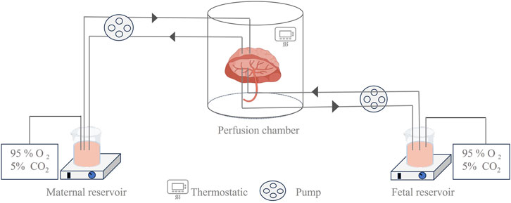 Figure 2. Illustration of the ex vivo dual-side cotyledon perfusion model. This device shows a schematic diagram of a dual closed-circuit extracorporeal placental perfusion test, which more closely simulates the process of maternal–fetal substance exchange and is widely used in the study of maternal–fetal transport mechanisms.