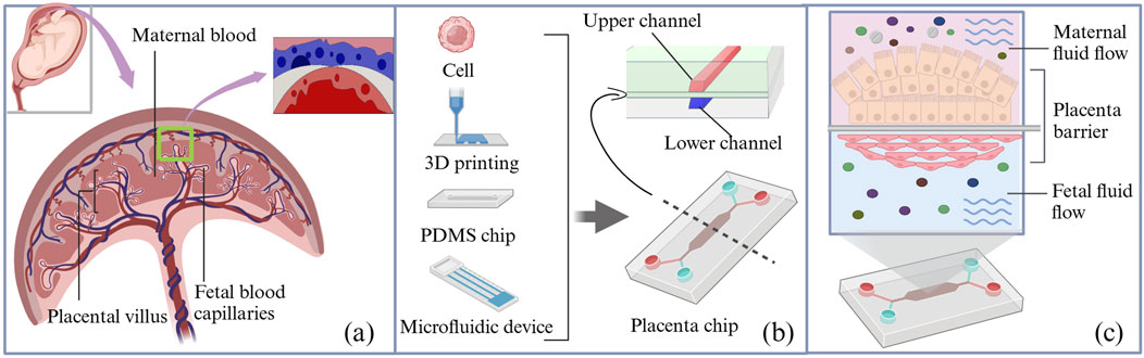 Ex vivo placental perfusion experiments, first proposed by Professor Maurice Panigel in 1967, have been continuously refined to address challenges such as revascularization and placental hypoxia resistance (Schneider et al., 2021). As research has expanded in recent years, new methods of studying placental drug-transport have emerged. Organ-on-a-chip technology, which integrates microfluidics and cell culture, replicates the human organ microenvironment on a chip and accurately simulates the blood flow, oxygen exchange, and nutrient delivery.