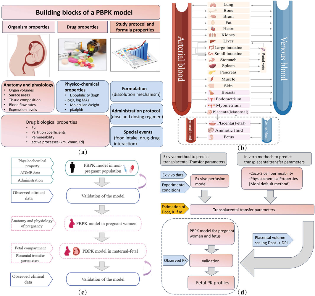 Figure 4. Maternal–fetal PBPK model details. (a) Building blocks for developing a PBPK model. (b) Structural diagram of the PBPK model of a pregnant woman in 27 compartments. The pink block section shows nine pregnancy-specific compartments. Fetal compartments can be refined according to the study objectives. (c) Workflow of maternal–fetal PBPK model development and evaluation. (d) Transplacental parameter estimation and integration. ADME, absorption, distribution, metabolism, and excretion. Dcot, transcotyledon passive diffusion clearance; Kf,m, partition coefficient between the fetal and maternal compartment; Dpl, transplacental passive diffusion clearance; PK, pharmacokinetics.