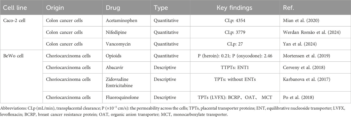 Current placental transport models include primary trophoblasts, trophoblast cell lines (BeWo b30, JEG-3, JAR, and HTR-8/SVneo), stem cell-derived systems, and intestinal Caco-2 (cancer coli-2) cells, with BeWo b30 and primary trophoblasts remaining the gold standards according to the FDA/ICH guidelines. We mainly focus on placental barrier studies, with studies on BeWo cells focusing on the mechanism of drug transport across the placenta and the role of transport proteins, while Caco-2 cells are mainly used to assess drug permeability across the placental barrier, and therefore, the two cellular studies will be described in detail below.