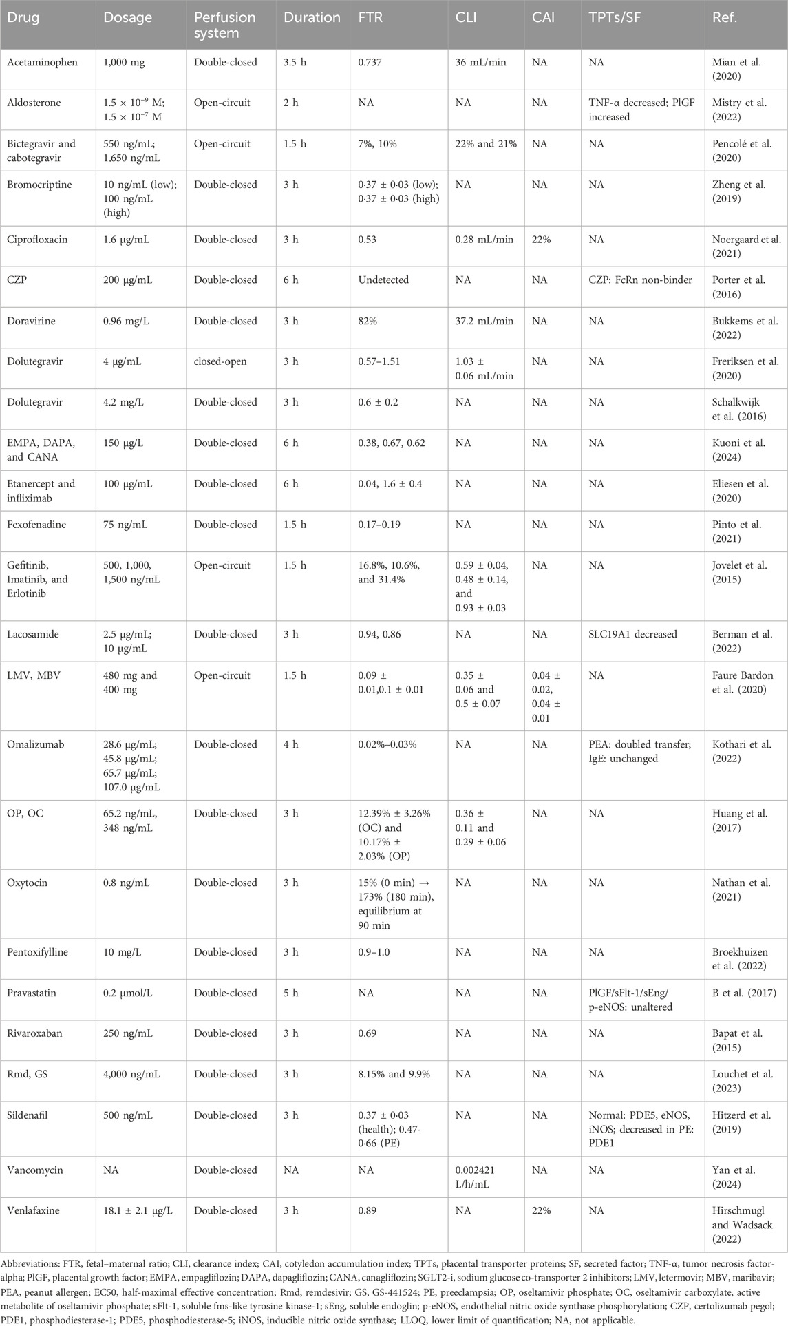 Ex vivo placental perfusion experiments comprised maternal and fetal reservoirs, the placenta, and a perfusion pump that simulated blood flow with controlled pressure and flow rate (Figure 2). A well-defined artery–vein pair on the fetal-side cotyledon with minimal branching was chosen for cannulation following the confirmation of intact placental integrity post-delivery (Jovelet et al., 2015). The system only remains patent for 2–6 h, so only short-term assessments can be made, and the circuit design (open, semi-closed, or closed loop) determines the physiological relevance, ranging from first-pass transfer simulation to steady-state PK assessment. The transfer process is mathematically described by Fick’s first law using the transfer equations outlined by Mian et al. (2020). Our review focused on 28 recent studies (2015–2025) employing ex vivo human placental perfusion to investigate transplacental kinetics of various therapeutics, including antivirals, psychotropics, and biologics (Table 2). This 10-year timeframe was selected to account for methodological advancements while ensuring data comparability. Notably, researchers exhibit a distinct preference for double-closed perfusion systems, which consistently operate for significantly longer durations than open-circuit configurations (avg. 3.6 h vs. 1.9 h). This operational divergence substantiates the superior suitability of double-closed systems for steady-state PK investigations. Small molecules dominate the studied drugs (30/34, 88%), exposing a critical evidence gap for biologics/antibodies despite their clinical relevance.
