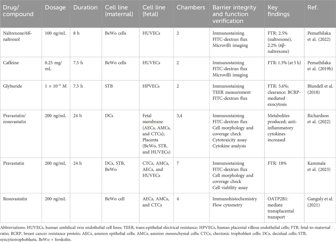 A comprehensive literature search revealed that, to date, placental drug transport has been evaluated and reported for only five pharmacological agents using the placenta-on-a-chip technology under controlled microphysiological conditions (Table 3), involving opioids, hypoglycemic agents, statins, and other drugs. Evidently, placenta-on-a-chip studies commonly use a core co-culture model of paired trophoblast cells (BeWo/STB) and endothelial cells (HUVECs/HPVECs) to replicate the maternal–fetal barrier. For statin (e.g., rosuvastatin)-specific studies, this basis can be extended to complex multicompartmental systems (3 layers–7 layers), which include fetal membrane cells (AECs, AMCs, and CTCs) and decidual cells (DCs) to mimic tissue interactions. Barrier integrity is generally verified by a tripartite protocol: immunostaining, FITC-dextran permeability assay, and morphological analysis, while some studies are supplemented with TEER measurements. Functionally, the simpler two-chamber design is sufficient for passive diffusion studies, whereas the ≥4-chamber configuration becomes crucial for drug metabolism studies, allowing important analyses of statin-derived metabolites and inflammatory cascades.