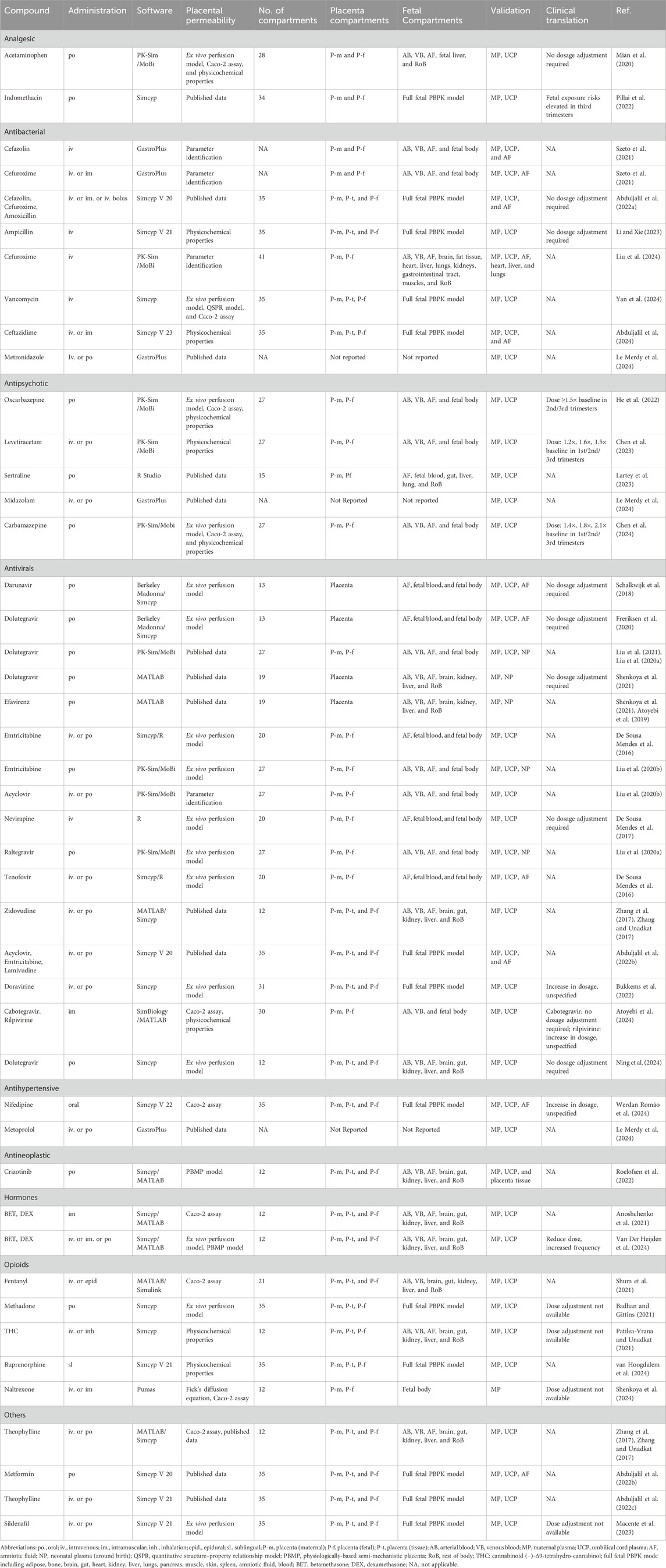 Although PBPK is a physiological PK simulation, it still relies on mathematical and mechanistic modeling. The goal of PBPK model development is to accurately reflect the in vivo physiological conditions. Studies have incorporated the fetal liver as an independent metabolic organ (Mian et al., 2020), considering the scaling of fetal drug-unbound fractions (Roelofsen et al., 2022) and adjusted parameters, such as fetal liver and kidney volumes and cytochrome P450 enzyme levels, to model fetal drug metabolism and clearance (Szeto et al., 2021). These efforts were aimed at improving the precision of fetal drug concentration predictions. Moreover, given the dynamic development of the placenta (Aplin et al., 2020) and the challenges in obtaining early pregnancy samples, future research should prioritize drug safety studies during early and mid-pregnancy to better guide maternal medication use. Further exploration of these approaches is crucial for future research as it will provide valuable evidence for clinical decision-making.