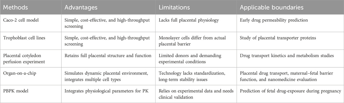 Current methods for placental pharmacokinetics include cell models, organ models, and in silico-guided models, each with its own distinct characteristics (Table 5). Monolayer cell models are convenient and rapid, but they oversimplify placental dynamics (Birch et al., 2018). Ex vivo and organ-on-chip systems offer greater physiological relevance, yet they face practical constraints (Pemathilaka et al., 2019a). In silico models, such as PBPK, allow quantitative predictions but rely on experimental data, highlighting the need for integrated approaches. A review of current studies shows that monolayer cell models are used to evaluate placental drug permeability and transporter-mediated transfer (Mian et al., 2020; Po et al., 2018), ex vivo and organ-on-a-chip systems quantify fetal drug exposure and pharmacokinetics (Freriksen et al., 2020; Zhang and Unadkat, 2017), and PBPK models support clinical dosing during pregnancy while predicting fetal drug exposure (Schneider et al., 2022; Abduljalil et al., 2022b).