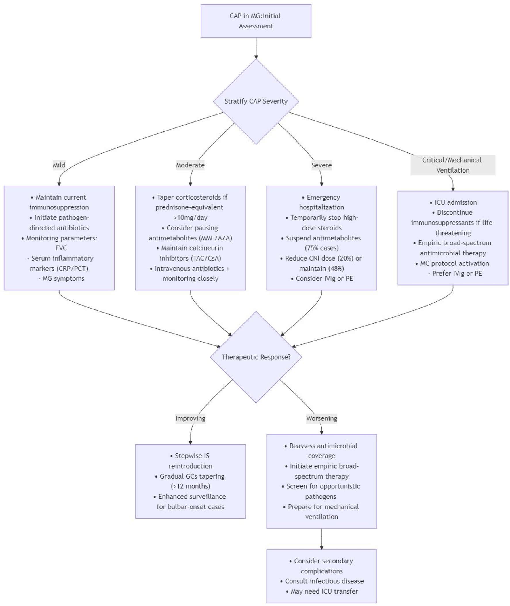 Tailoring immunosuppressive strategies according to CAP severity grading facilitates optimal management of both MG and infection control. This algorithm provides a structured framework for the initial assessment and management of MG patients with CAP, based on disease severity stratification. Key components include.