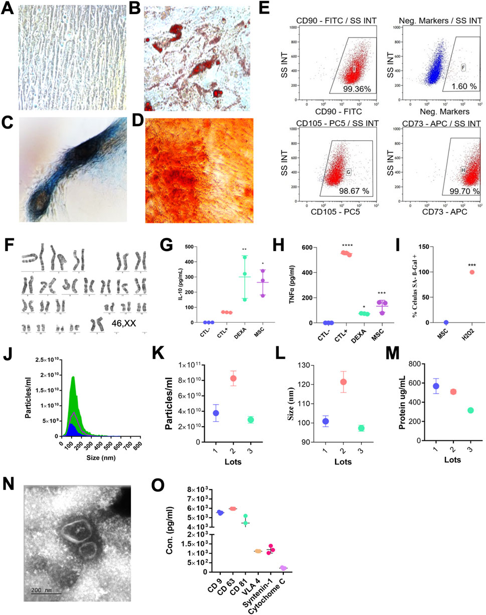 Figure 1. Characterization of MSCs and EVs. (A) Representative image of undifferentiated MSCs and differentiated MSCs toward adipogenic (B), chondrogenic (C), and osteogenic (D) lineages in vitro. (E) Representative flow-cytometry dot plots showing positive expression of MSC surface markers (CD73, CD90, CD105) and lack of hematopoietic markers (CD34, CD45, CD11b, CD19, HLA-DR). Data representative of three independent analyses. (F) Representative G-banded karyotype confirming genomic stability (46,XX). (G,H) Immunomodulatory potency of MSCs assessed in co-culture with activated PBMCs, showing IL-10 upregulation and TNF-α suppression. Experimental conditions: Ctl–, unstimulated PBMCs; Ctl+, PBMCs stimulated with anti-CD3/CD28; Dexa, PBMCs stimulated with anti-CD3/CD28 and treated with dexamethasone; MSC, PBMCs stimulated with anti-CD3/CD28 and co-cultured with MSCs for 5 days. Cytokines were quantified by ELISA. (I) Quantification of SA-β-gal-positive cells showing low senescence levels in MSCs compared with H2O2-treated controls. (J–L) Nanoparticle tracking analysis (NTA) showing EV particle size distribution and concentration obtained from three independent EV batches. (M) Total protein content of EV samples (µg/mL); values represent mean ± SD of three EV lots. (N) Representative transmission electron microscopy image showing typical cup-shaped EV morphology (50–150 nm; scale bar, 200 nm). (O) EV protein marker profiling showing strong expression of canonical exosomal markers (CD9, CD63, CD81) together with VLA-4 and syntenin-1, and minimal levels of cytochrome C (assessed by Luminex; n = 3 EV lots). Statistical analysis: (G,H) one-way ANOVA with Tukey multiple-comparison test versus Ctl+; (I) unpaired t-test (two-tailed). Data are presented as mean ± SD; n = 3 biological replicates per condition. *p < 0.05; **p < 0.01; ***p < 0.001.