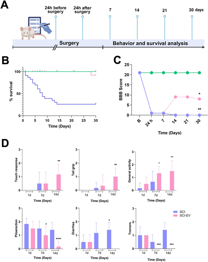 Figure 2. EVs improve survival and locomotor recovery after SCI. (A) Experimental timeline showing EV administration (1 × 109 particles/rat, administered intralesionally, immediately post-injury) and follow-up up to 30 days. (B) Survival curves of control (green), SCI (blue), and SCI-EVs (pink) groups showing markedly reduced survival after SCI, which was partially improved by EV treatment. Statistical analysis was performed using the log-rank (Mantel–Cox) test (n = 20 per group). *p < 0.05, **p < 0.01 vs. SCI. (C) Locomotor function assessed using the BBB scale by two independent blinded evaluators. SCI-EVs animals (pink) showed progressive functional improvement from day 14 onward compared to the SCI group (blue), while controls (green) maintained normal scores (n = 7 per group). (D) Clinical and behavioral recovery scoring according to a modified 0–3 scale (n = 7 per group). Upper panels: neuromuscular parameters (touch response, tail grip, general activity) were scored as 0 = severe impairment, 1 = moderate, 2 = mild, 3 = normal. Lower panels: autonomic/toxicity parameters (piloerection, diarrhea, tremors) were scored as 0 = normal, 1 = mild, 2 = moderate, 3 = severe. (C,D) Data are presented as mean ± SD. Statistical analysis was performed using two-way ANOVA followed by Dunnett’s post hoc test. *p < 0.05, **p < 0.01, ***p < 0.001 compared with the SCI group.