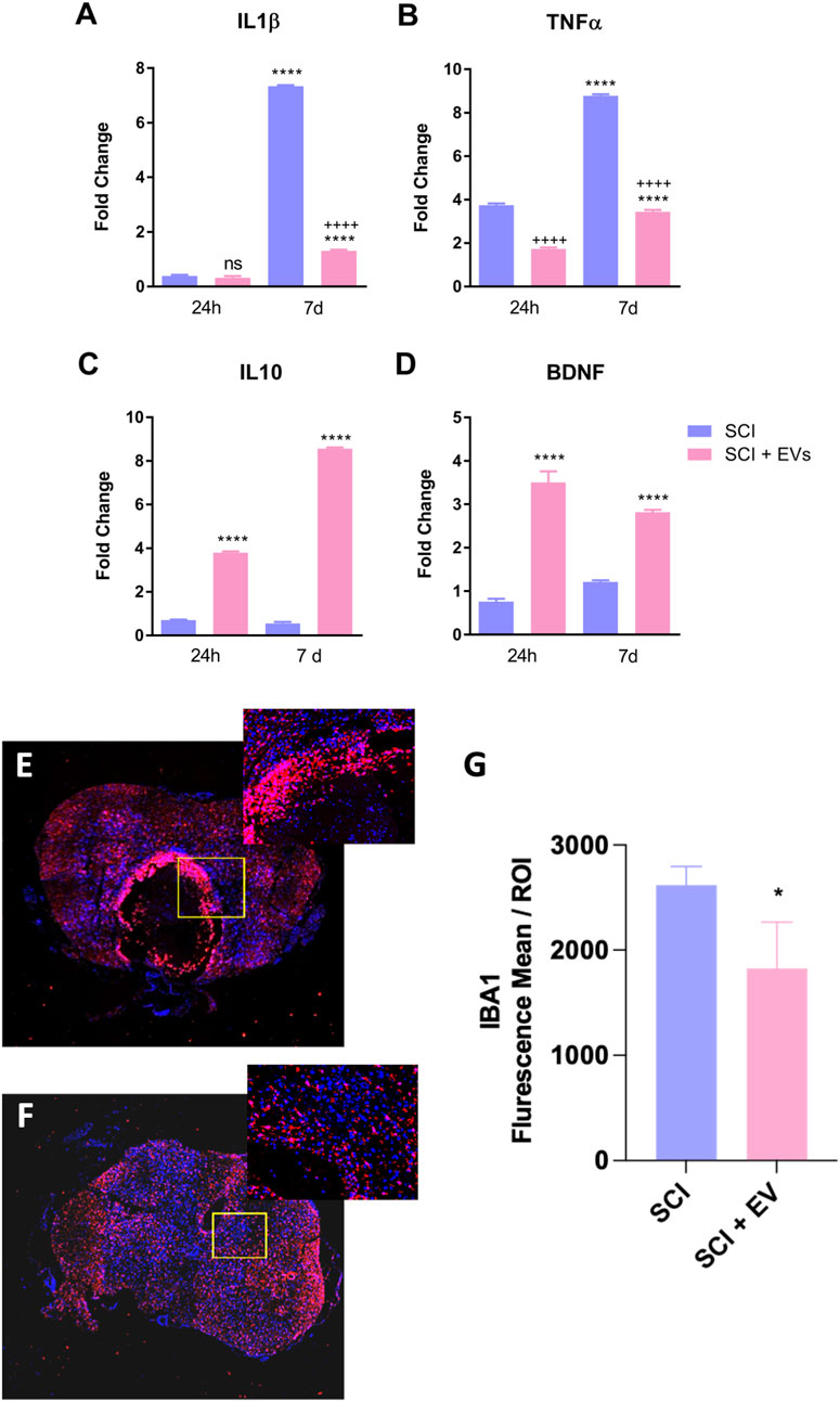 Figure 3. EV treatment modulates inflammatory cytokines and microglial activation after spinal cord injury. Relative gene expression of (A) IL-1β, (B) TNF-α, (C) IL-10, and (D) BDNF in SCI and SCI-EV groups was determined by RT-qPCR. Data were normalized to GAPDH and expressed as fold change relative to non-injured controls. (E,F). Values represent mean ± SD (n = 7 per group/time point, one-way ANOVA with Tukey multiple-comparison test). Representative confocal images of IBA1 (red) and DAPI (blue) immunofluorescence in spinal cord sections from SCI (E) and SCI + EVs (F) groups at 7 days post-injury (200x magnification). Insets show higher magnification of the lesion border. (G) Quantification of IBA1 immunoreactivity (mean fluorescence intensity per ROI) showing decreased microglial activation in EV-treated rats (n = 5-7 per group, unpaired t-test, p < 0.05). ns = not significant; p < 0.05; p < 0.001 vs. SCI; “+” indicates downregulation relative to SCI; data presented as mean ± SD.