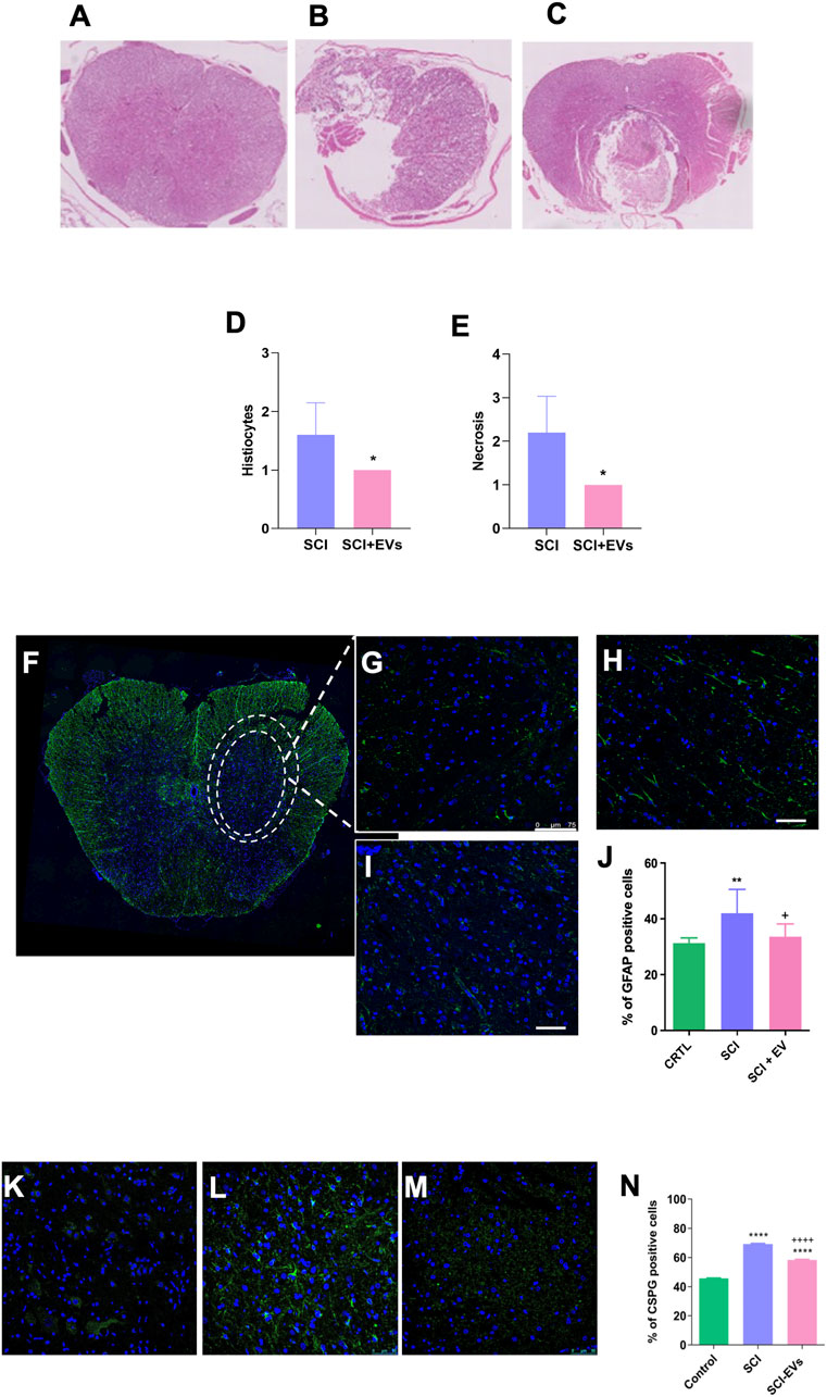 Histological analysis at 7 days post-injury revealed extensive tissue damage and cavity formation in the SCI group, whereas animals treated with EVs showed a reduced lesion area and tissue preservation (Figures 4A–C). Semiquantitative assessment of histiocytic infiltration and necrosis in H&E-stained sections demonstrated a significant reduction in lesion severity in the SCI-EV group compared with untreated SCI animals (p < 0.05; Figures 4D,E). Immunofluorescence staining further demonstrated a marked accumulation of GFAP-positive astrocytes in the SCI group, consistent with glial scar formation (Figures 4F–I). In contrast, EV-treated animals (Figure 4I) exhibited attenuated astrocytic reactivity as reflected by the reduced density of GFAP-positive cells (***p < 0.001; Figure 4J). Additionally, immunolabeling for chondroitin sulfate proteoglycans (CSPGs, Figures 4K–M) revealed pronounced matrix deposition in the SCI group (Figure 4L), whereas EV administration substantially reduced CSPG accumulation (+++p < 0.001; Figure 4N). Quantitative analysis confirmed that CSPG expression was significantly higher in the SCI group compared with controls (****p < 0.0001), and attenuated following EV treatment, indicating mitigation of glial scar formation.