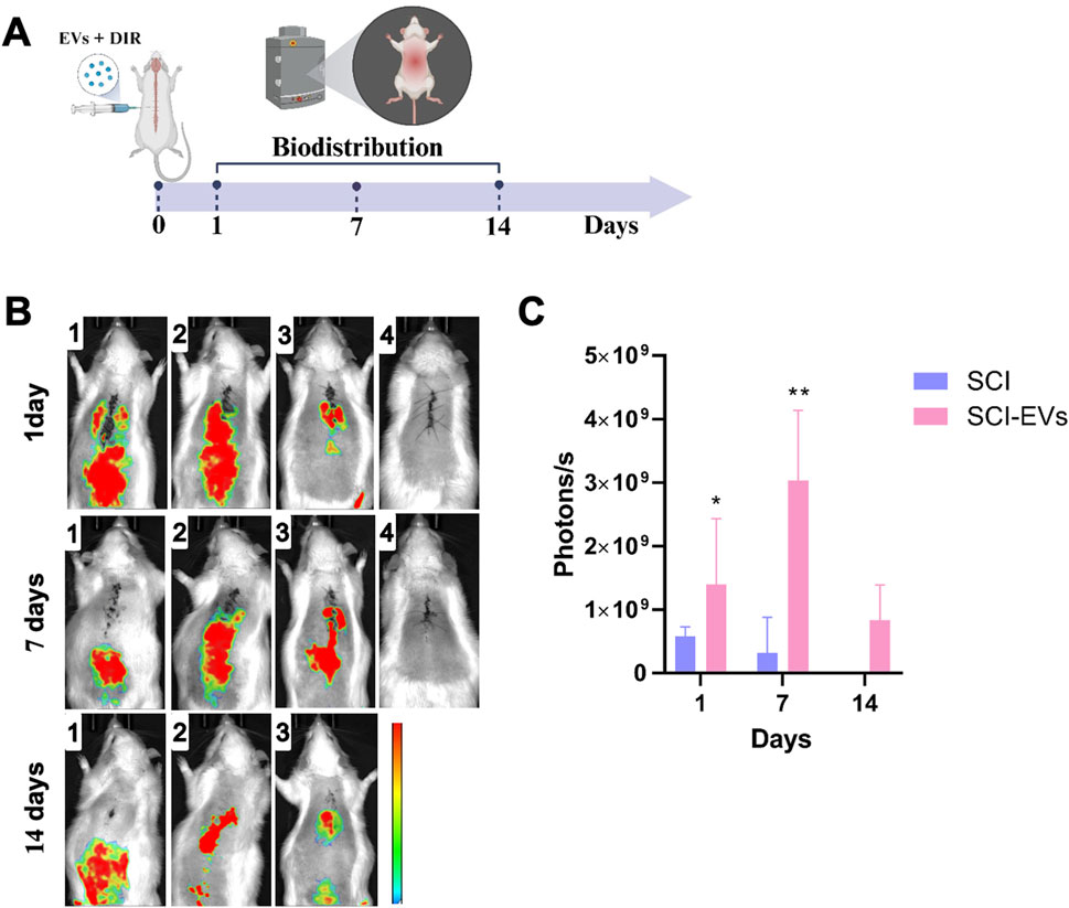 Figure 5. In vivo biodistribution of DiR-labeled EVs after local injection in SCI. (A) Schematic representation of the experimental timeline and marked imaging time points. EVs were labeled with the near-infrared dye DiR and locally injected at the lesion site in SCI rats. (B) Representative fluorescence images acquired at days 1, 7, and 14 post-injection. Each row represents the SCI-EVs group, and each column corresponds to a different animal (1–3) and control (4), showing fluorescence signals predominantly localized in the thoracic spinal cord region. (C) Quantification of photon emission revealed significantly higher fluorescence intensity in the SCI-EVs group compared to SCI. Data are presented as mean ± SD (SCI, n = 3; SCI-EVs, n = 6) and were analyzed using two-ANOVA followed by Tukey’s post hoc test. *p < 0.05; **p < 0.01.