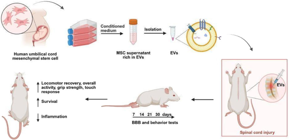 Discussion: Together, these findings demonstrate that early intralesional delivery of MSC-EVs enhances survival, modulates the inflammatory response, and promotes functional recovery after SCI, supporting further translational development of EV-based interventions for SCI.