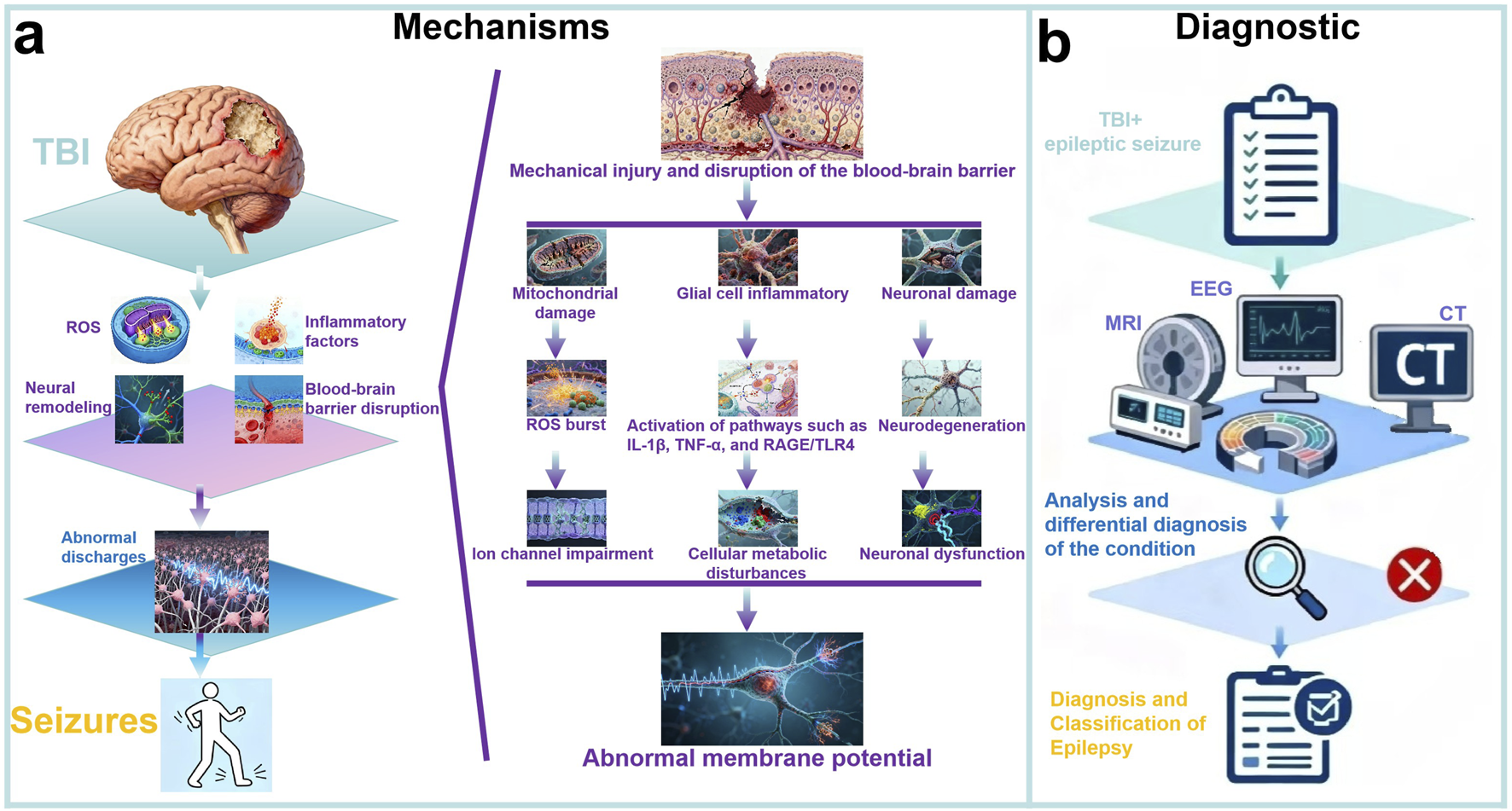 Mechanisms and Diagnostic Process of PTE. (a) Mechanisms of PTE: PTE develops after TBI through interconnected molecular mechanisms. Neuroinflammation (e.g., IL-1β, TNF-α, RAGE/TLR4 pathways) promotes epileptogenesis, exacerbated by blood-brain barrier disruption. Cellular remodeling in the dentate gyrus impairs neural networks, while oxidative stress induces mitochondrial dysfunction. These processes form a complex molecular network underlying PTE; (b) Diagnostic of PTE: The diagnosis and classification of PTE are confirmed by integrating TBI and seizure history, examinations such as EEG, CT, and MRI, as well as history analysis and differential diagnosis of epilepsy.