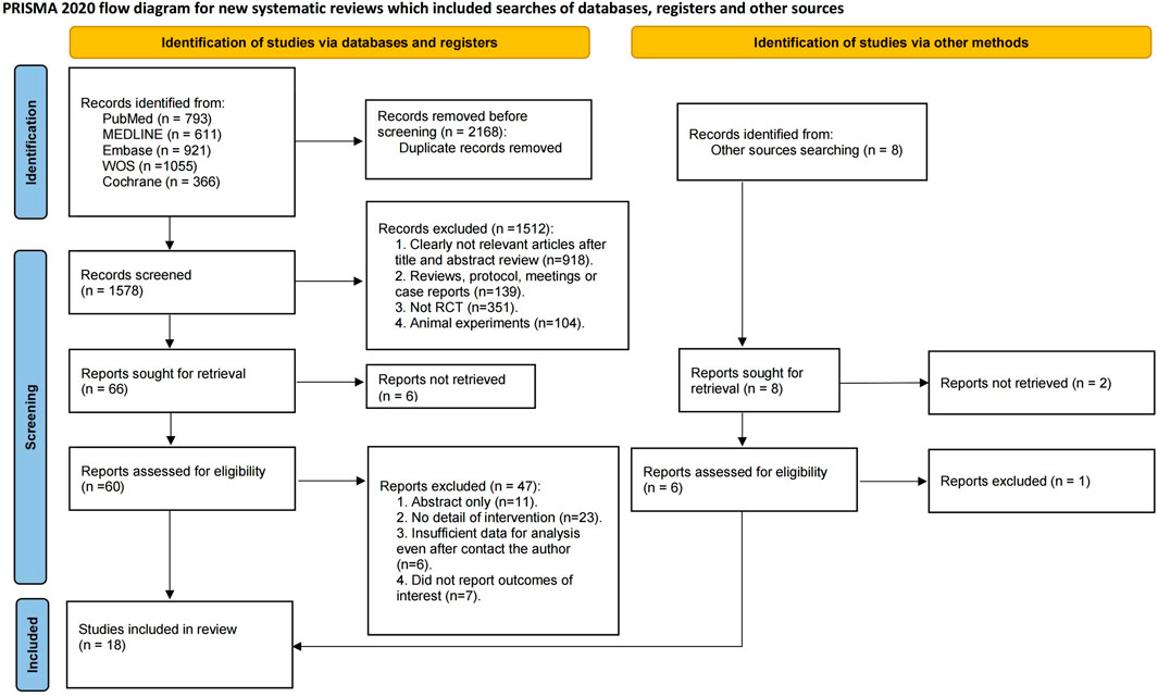 PRISMA 2020 flow diagram shows the process of selecting studies for systematic review. Initial identification involved 1578 records from databases and 8 from other sources. After removing duplicates and exclusions, 74 reports were sought for retrieval. Sixty-six were assessed for eligibility, with 47 other exclusions. Ultimately, 18 studies were included in the review.