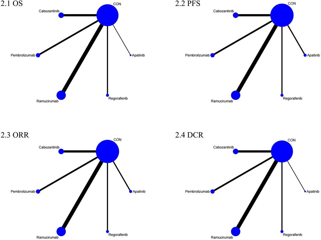 Four comparative network diagrams labeled 2.1 OS, 2.2 PFS, 2.3 ORR, and 2.4 DCR show connections between treatments: Cabozantinib, Pembrolizumab, Ramucirumab, Apatinib, Regorafenib, and a central node labeled CON. Lines vary in thickness, indicating different levels of influence or connection strength among treatments. Each treatment is connected to CON by lines of differing thickness.